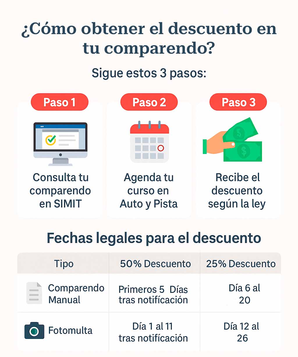 50% de descuento si pagas tu comparendo y realizas el curso dentro de los 5 días hábiles siguientes a la imposición del comparendo.